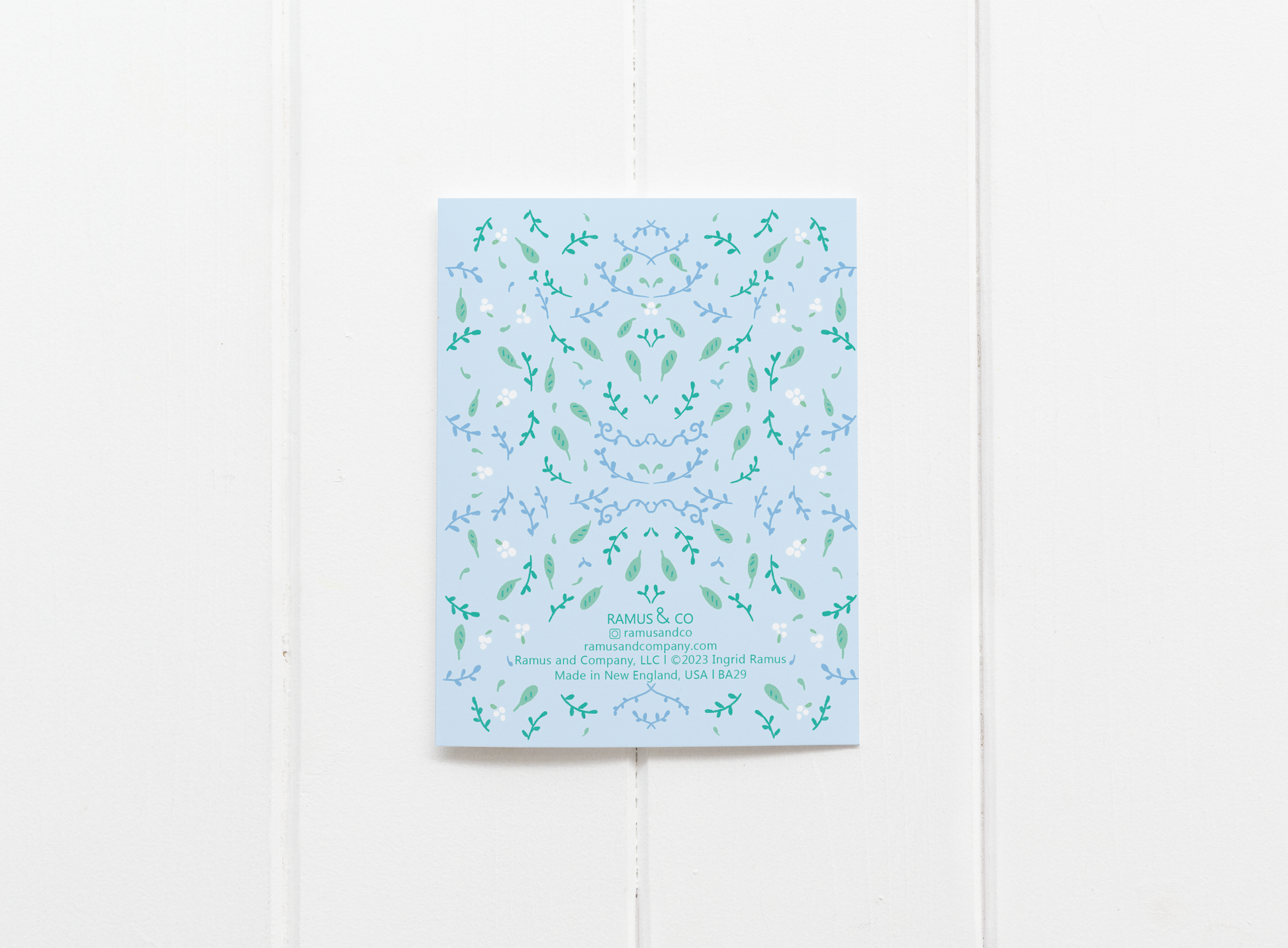 All our cards are printed on SFI and FSC certified paper. Designed and printed in New England, USA. Beautiful bright white cover paper, blank inside, includes an envelope with peel & stick.