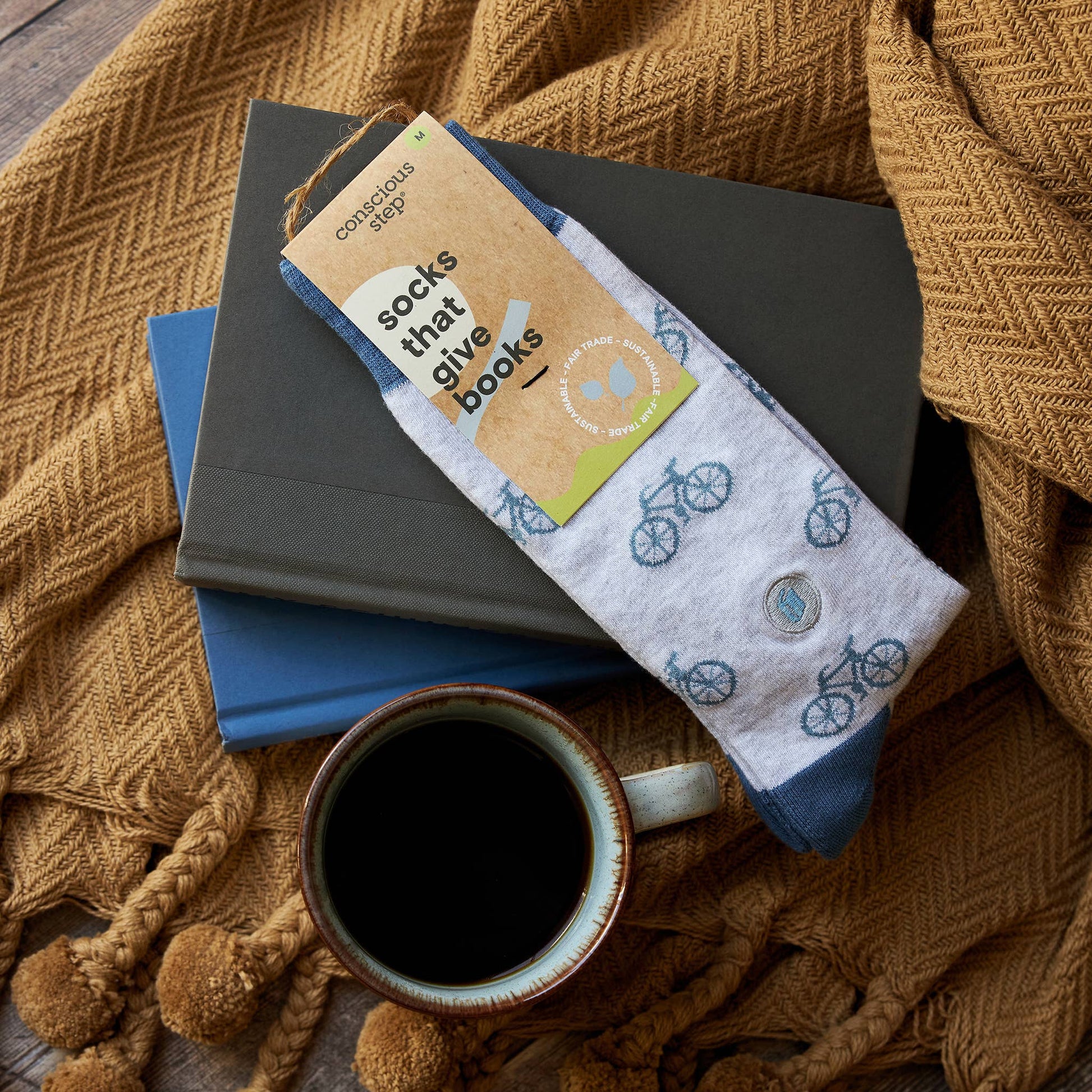 Bikes and books! Supply books to kids with these fun bicycle themed socks featuring a blue design on gray plus a book embroidery. Each pair supports Room to Read and their work to improve literacy and equality for school children.