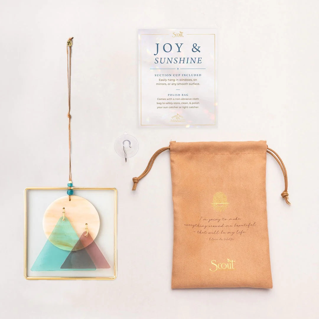 Thoughtfully designed to cast a magical glow, these luminous accents turn sunlight into a mesmerizing dance of color and light. Each piece of stained glass is hand cut and framed in graceful gold in one of four harmonious designs. The addition of glass and metal beads on the natural cord creates a thoughtful, layered accent. Every stained glass light catcher comes in a beautiful polish bag making it the perfect gift to create wonder from light.