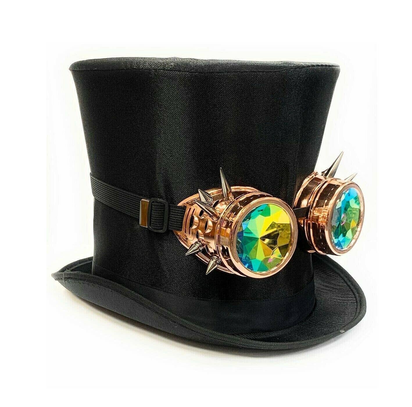 This steampunk set is perfect for anyone who is looking for a special touch for there steampunk outfit. The top shaped hat can be worn with the goggles on the hat or separately. The choice is completely yours!