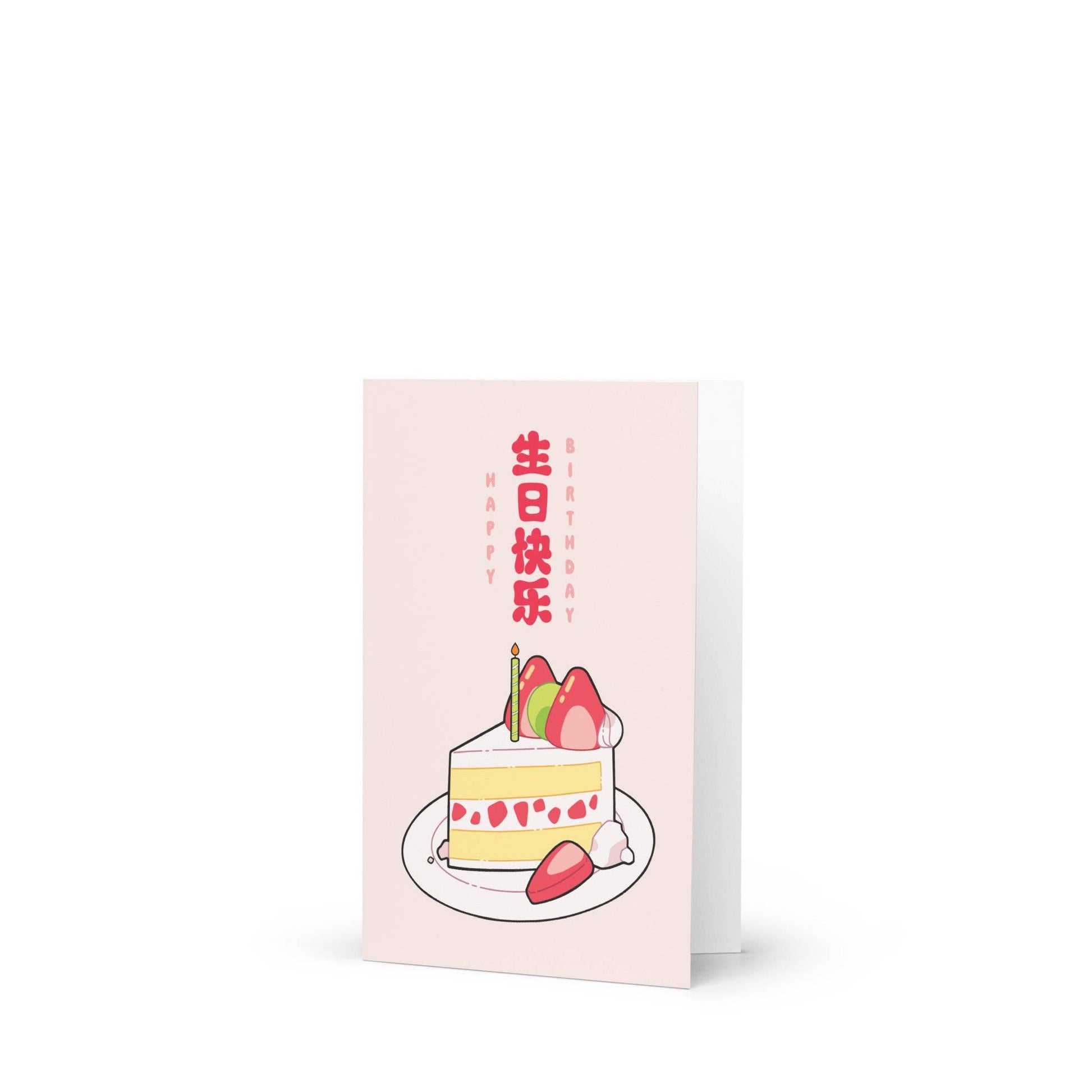 Strawberry Cake Chinese Birthday Card | Cute Slice Mandarin Happy Greetings