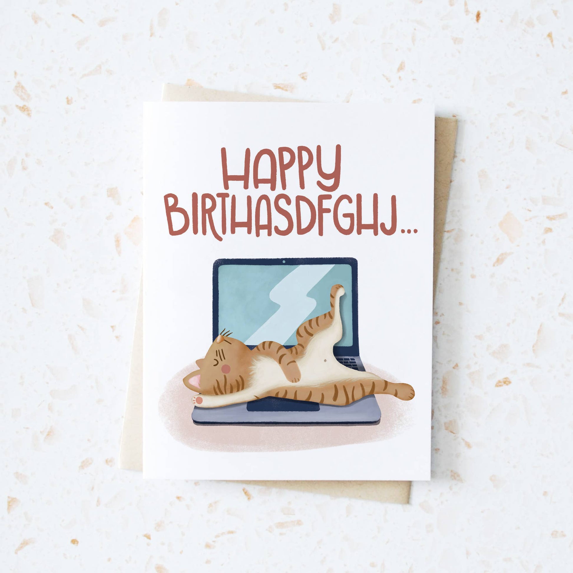 This card is purr-fect to wish someone special a happy birthday! Featuring a funny tabby cat sleeping in the most unusual pose on top of a computer laptop. What a cheeky way to celebrate! It comes with a natural brown Kraft envelope and is blank inside.