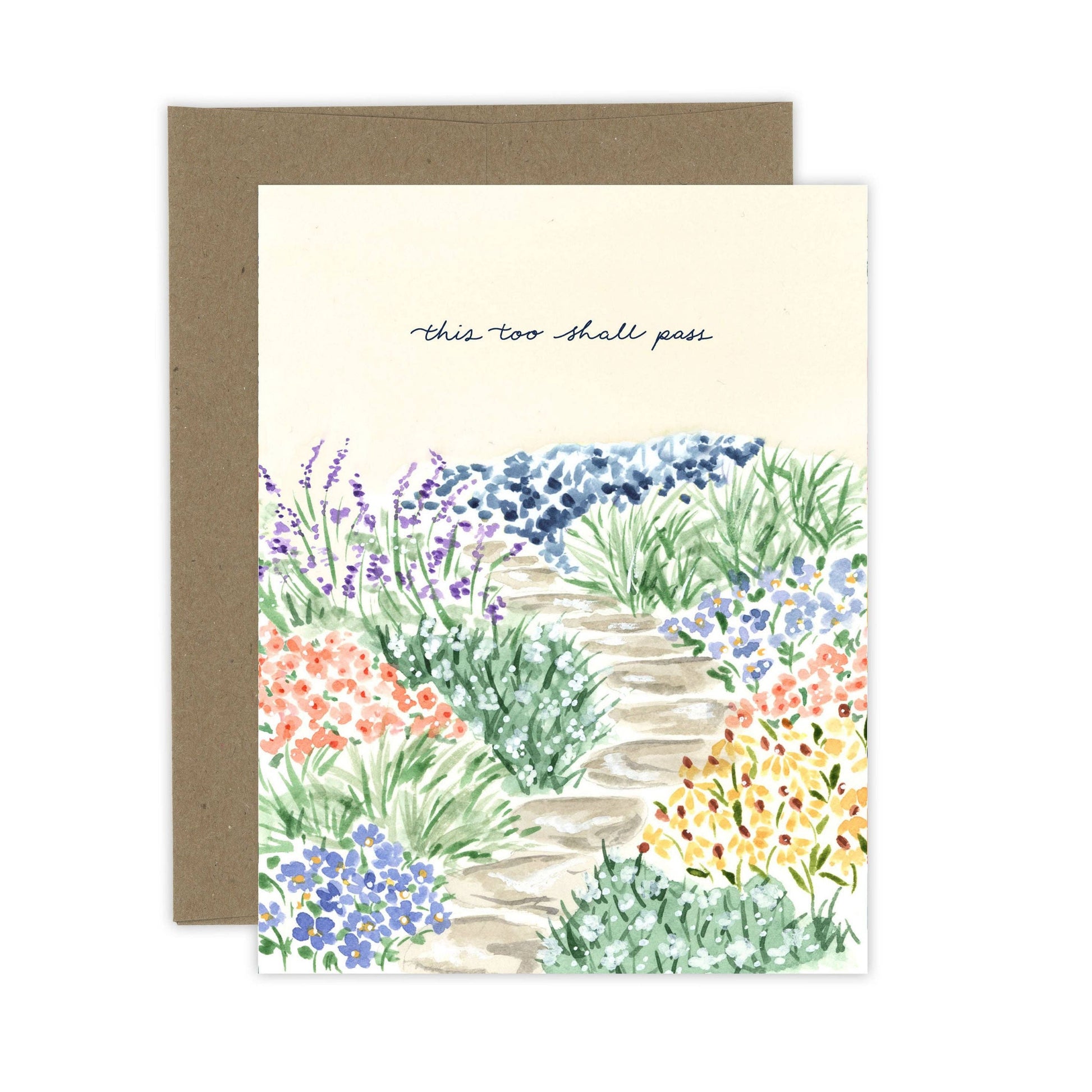 Offer comfort and hope with this thoughtful card featuring a serene watercolor garden and the timeless message, “This Too Shall Pass.” Soft florals and calming colors create a peaceful scene, perfect for sending encouragement during difficult times. Printed on high-quality textured cardstock with a blank interior, this card is a beautiful way to remind someone they’re not alone and brighter days are ahead.