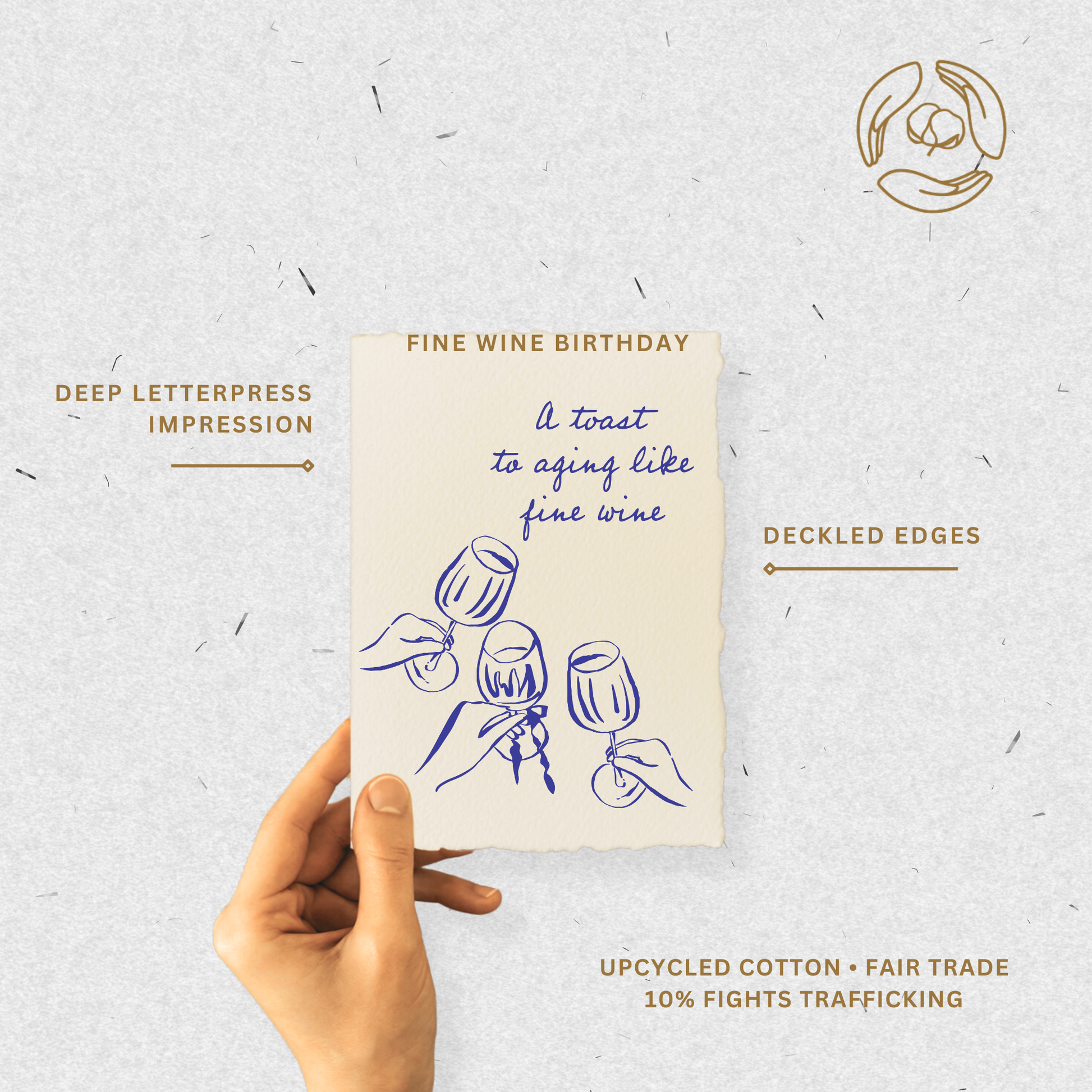Eco-Friendly. Fair Trade. Gives Back. Handmade letterpress cards made from up-cycled cotton rags intended to be discarded by the garment industry. Inspired by textures, letterpress, sustainability, coffee and people. 10% of our proceeds are donated to fight human trafficking. A fancy French birthday greeting card for wine enthusiasts and to those aging gracefully!